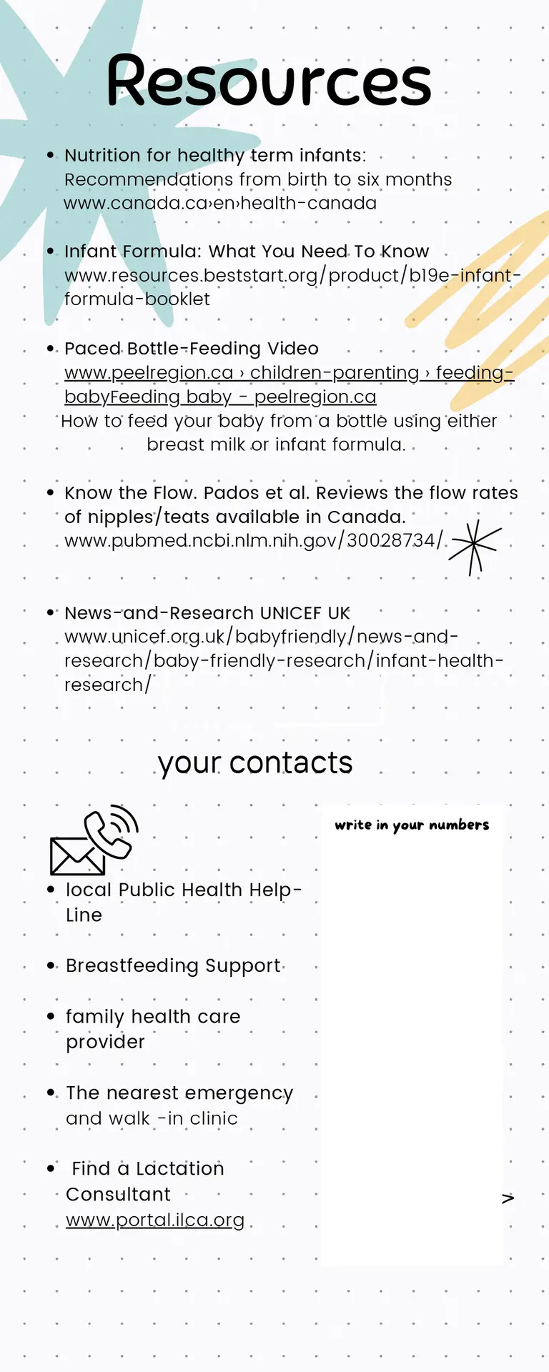 Helpful links and resources from various organizations and associations to assist parents with various aspects of baby friendly standards: